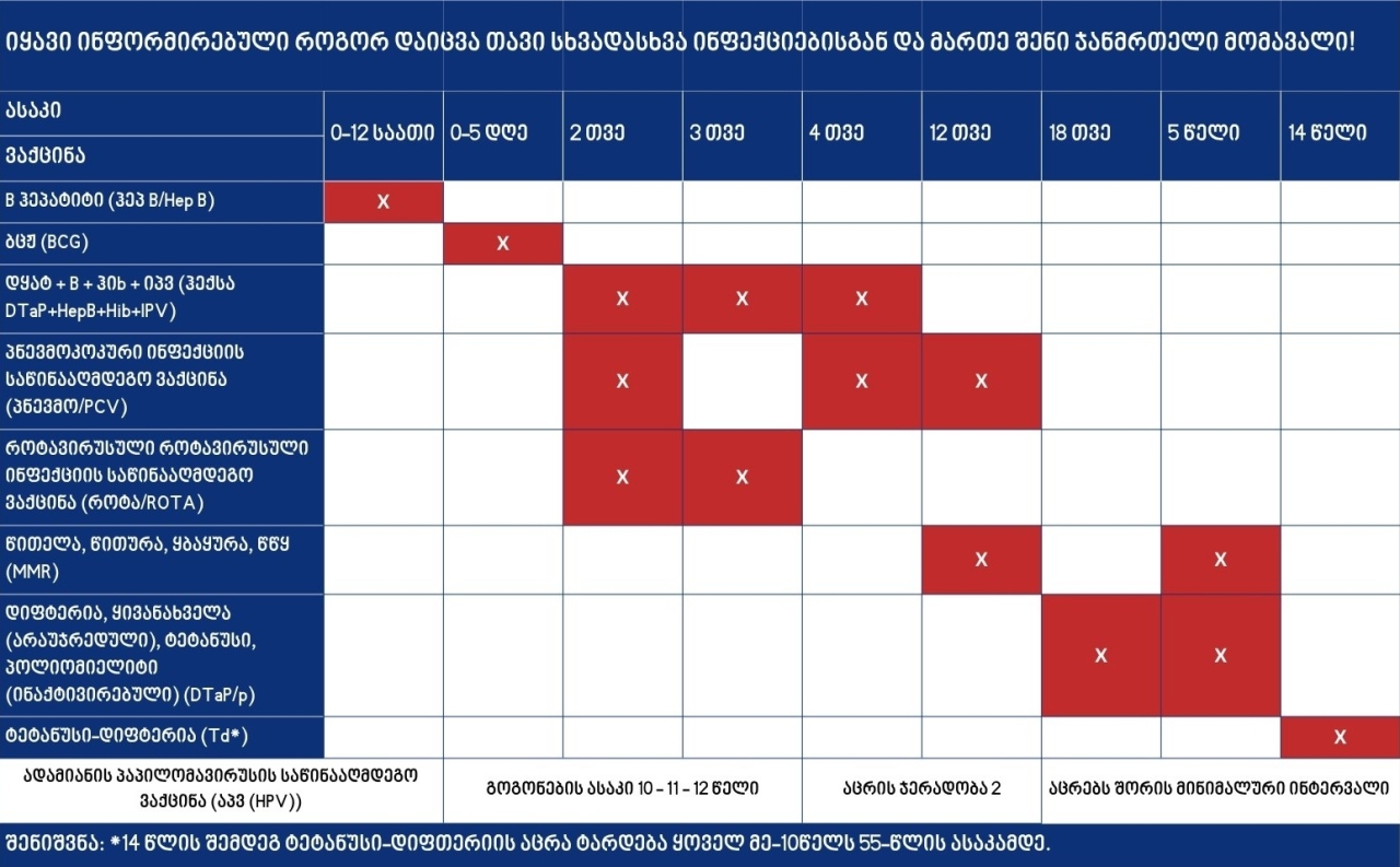აუცილებელია ვიცოდეთ როდის და რა აცრები უნდა ჩავუტაროთ ჩვენს შვილებს. გაიგე რატომ უნდა აცრა შენი შვილი და რა მნიშვნელობა აქვს სავალდებულო აცრებს? 1.B ჰეპატიტის (hepB/Hep B) ვაქცინა - B ჰეპატიტის ვაქცინა B ჰეპატიტისგან იცავს თავად ბავშვსაც და მასთან კონტაქტში მყოფ სხვა ადამიანებსაც. B ჰეპატიტის მქონე ბავშვებს, როგორც წესი, არ აქვთ დაავადების სიმპტომები, მაგრამ შეუძლიათ, ვირუსი სხვებს გადასცენ. B ჰეპატიტის საწინააღმდეგო ვაქცინა რამდენიმე დოზას მოიცავს. პირველი კეთდება სამშობიაროში, დაბადებიდან 12 საათის განმავლობაში, მომდევნოები - მეორე, მესამე და მეოთხე თვეს. თუ დედას სისხლში აღმოაჩნდა B ჰეპატიტის ვირუსის ზედაპირული ანტიგენი (HbsAg), ჩვილს ვაქცინასთან ერთად B ჰეპატიტის საწინააღმდეგო იმუნოგლობულინსაც უკეთებენ. 2. ბცჟ (BCG) – ტუბერკულოზის საწინააღმდეგო ვაქცინა- ტუბერკულოზის საწინააღმდეგო ვაქცინაცია ტარდება სამშობიაროში, დაბადებიდან პირველი 5 დღის განმავლობაში, თუ ეს ვერ მოხერხდა - პირველივე შესაძლებლობისთანავე წლამდე. ამ ასაკის შემდეგ ბცჟ-ს გაკეთება რეკომენდებული არ არის, რადგან ვაქცინის დამცავი ეფექტი იკლებს. 3. ჰექსა – დყატ+Bჰეპ+ჰიb+იპვ ვაქცინა 2, 3, და 4 თვის ასაკში კეთდება კომბინირებული ექვსკომპონენტიანი ვაქცინა დყატ+Bჰეპ+ჰიb+იპვ (ჰექსა/DPaT+HepB+Hib+IPV). დყატ არის დიფტერიის, ყივანახველისა (არაუჯრედულის) და ტეტანუსის საწინააღმდეგო ვაქცინა, B ჰეპ – B ჰეპატიტის, ჰიბ – ჰემოფილუს ინფლუენცა ტიპი ბ–სი, იპვ – ინაქტივირებული პოლიომიელიტისა. კურსი სამ დოზას მოიცავს, აცრებს შორის მინიმალური ინტერვალი 4 კვირაა. ვაქცინირება რეკომენდებულია 24 თვემდე. 4. PNEVMO/PCV – პნევმოკოკის საწინააღმდეგო ვაქცინა პნევმოკოკური ინფექციის საწინააღმდეგო ვაქცინა (PNEVMO/PCV) სამ დოზას მოიცავს. აცრა ტარდება 2, 4, 12 თვის ასაკში. ის ბავშვს იცავს პოტენციურად სასიკვდილო ინფექციებისგან – პნევმოკოკური მენინგიტისა და პნევმოკოკური პნევმონიისგან. ვაქცინა უსაფრთხო და ეფექტურია, თუმცა არ არის გამორიცხული მსუბუქად გამოხატული გვერდითი მოვლენები. 5. როტა/ROTA - ვირუსის საწინააღმდეგო ვაქცინა როტავირუსული ინფექციის საწინააღმდეგო ვაქცინა (როტა/Rota) ინიშნება პერორალურად (წვეთებით). კურსი ორ დოზას მოიცავს. პირველი დოზის მიცემა რეკომენდებულია 16 კვირამდე, მეორისა – 24 კვირამდე. აცრა ბავშვს იცავს როტავირუსით გამოწვეული ძლიერი დიარეის, ღებინებისა და მუცლის ტკივილისგან. ვაქცინა უსაფრთხოა, თუმცა, როგორც ნებისმიერმა წამალმა, შესაძლოა გამოიწვიოს მსუბუქი თანამოვლენებიც (დიარეა, ღებინება). 6. წწყ/MMR ვაქცინა წითელა-წითურა-ყბაყურას (წწყ/MMR) 